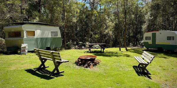 A private glamping site set just metres from the upper waterfalls, featuring two vintage caravans — Honey and Wattle — in a quiet bush setting. The site includes a fire pit and outdoor kitchen, with easy access to the falls and swimming hole. Ideal for guests who want a comfortable, low-effort outdoor stay with space to relax and explore the surrounds.
